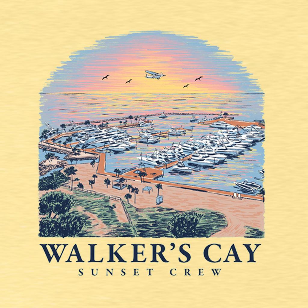 This pale-yellow Comfort Colors pocket tee brings the island glow to your everyday lineup. Made on the classic 6.1 oz garment-dyed cotton blank for that soft, lived-in feel, it features a vibrant overlook of the Walker’s Cay marina — boats docked, sun on the horizon, pure island magic. Easy, comfortable, and built for anyone who carries a little bit of Walker’s Cay wherever they go.